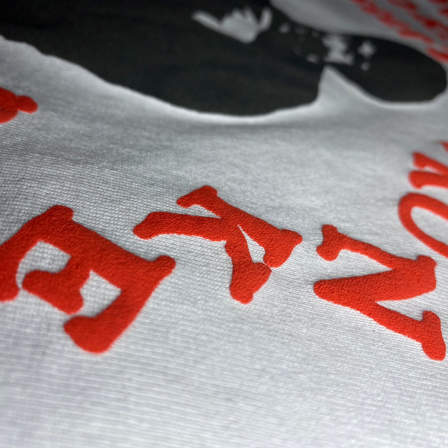 Puff print on front and back. Heavy 6.0 oz weight white t-shirts. Recommended hand wash and air dry to preserve print. Print will slightly vary between each shirt. Please confirm your size in the info below before ordering. All sales are final.