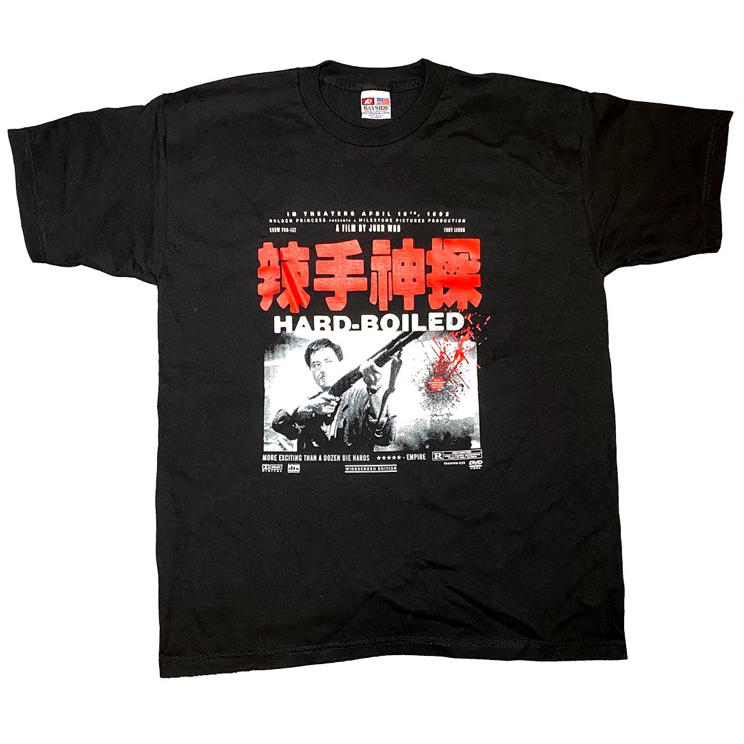 Hard Boiled was theatrically released in Hong Kong on April 16th 1992. This is a celebration of the film's 30th Anniversary. Not a 1:1 reissue of the original Hard Boiled t-shirt with various updates, see newsletter for details. The film stars Chow Yun-fat (Crouching Tiger, Hidden Dragon), Tony Leung (Infernal Affairs), Teresa Mo (Tomorrow Is Another Day), Philip Chan (Double Impact), Philip Kwok (Five Deadly Venoms), and Anthony Wong (The Mummy: Tomb of the Dragon Emperor). Directed by John Woo, this would be John's final Hong Kong film before taking on Hollywood directing films Broken Arrow, Face/Off, Mission:Impossible 2 and more.